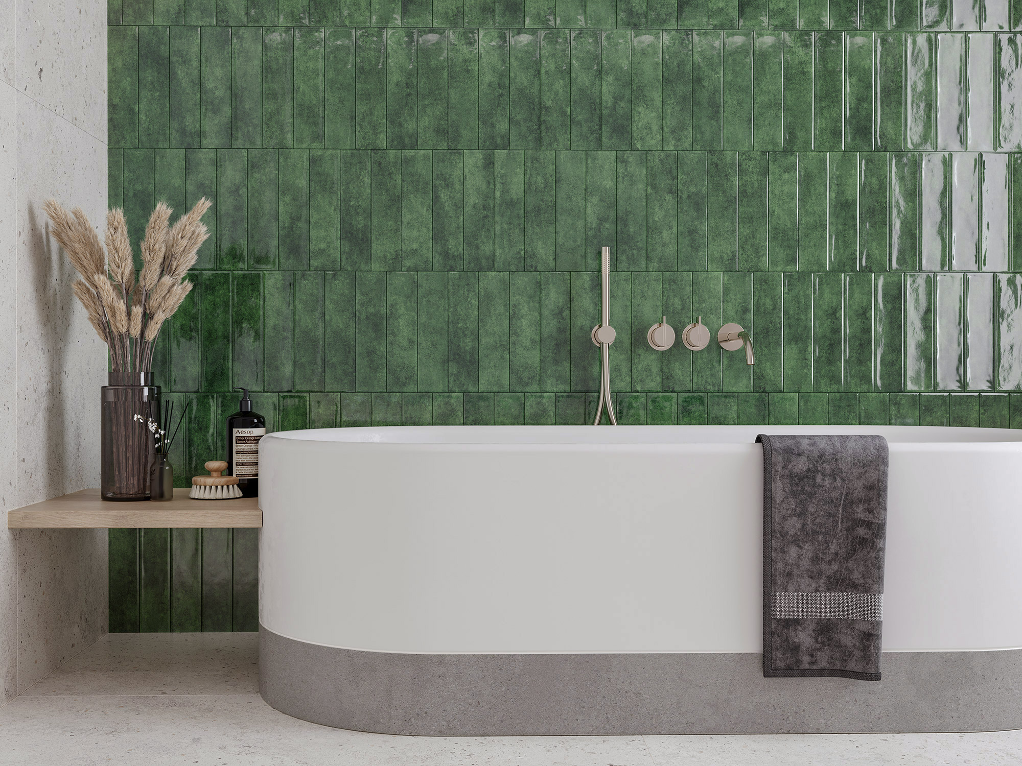 These glossy green wall tiles pair especially well with wood-effect tiles, stone surfaces, brushed brass fittings, and neutral palettes, helping you create a balanced and stylish design scheme.