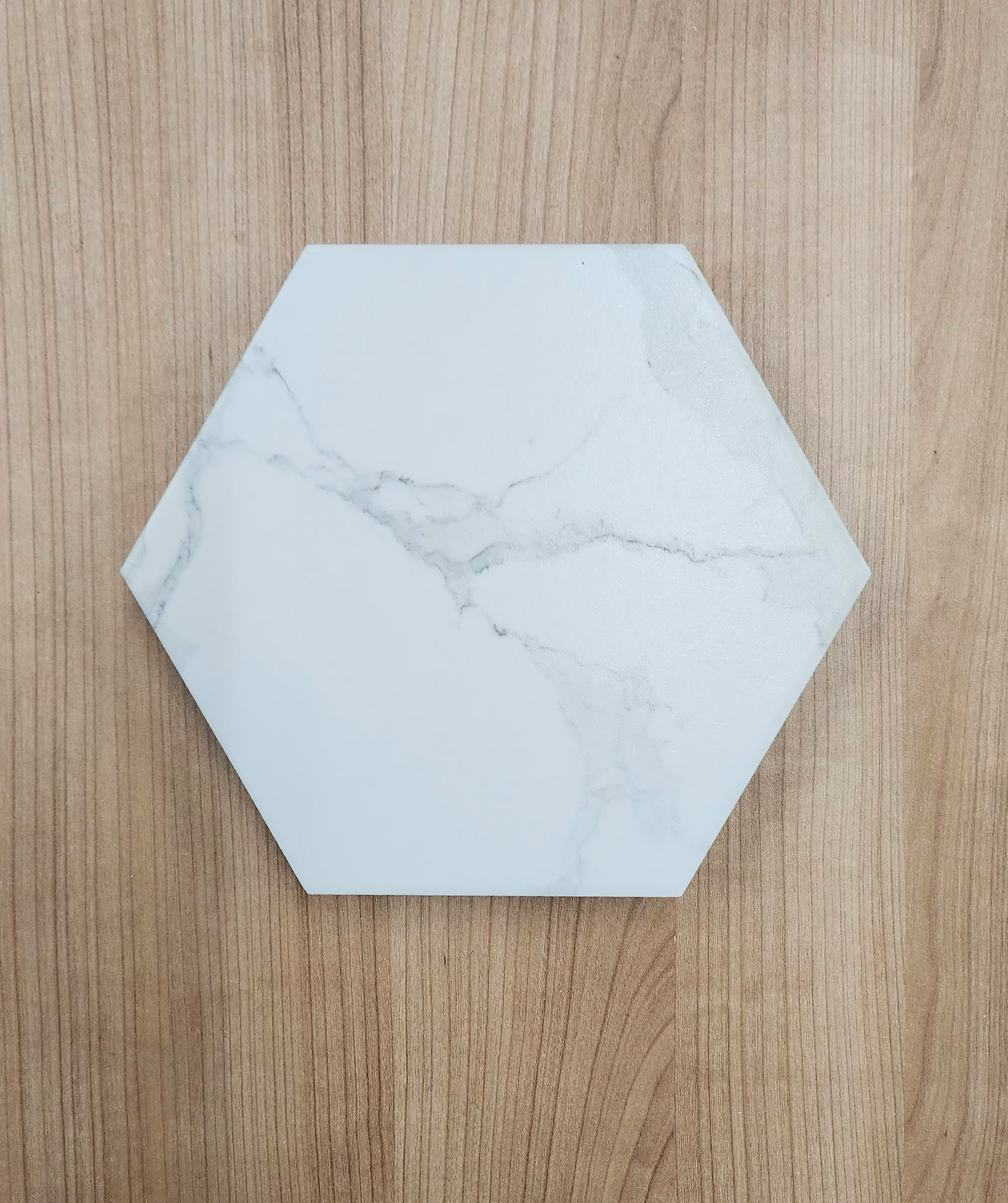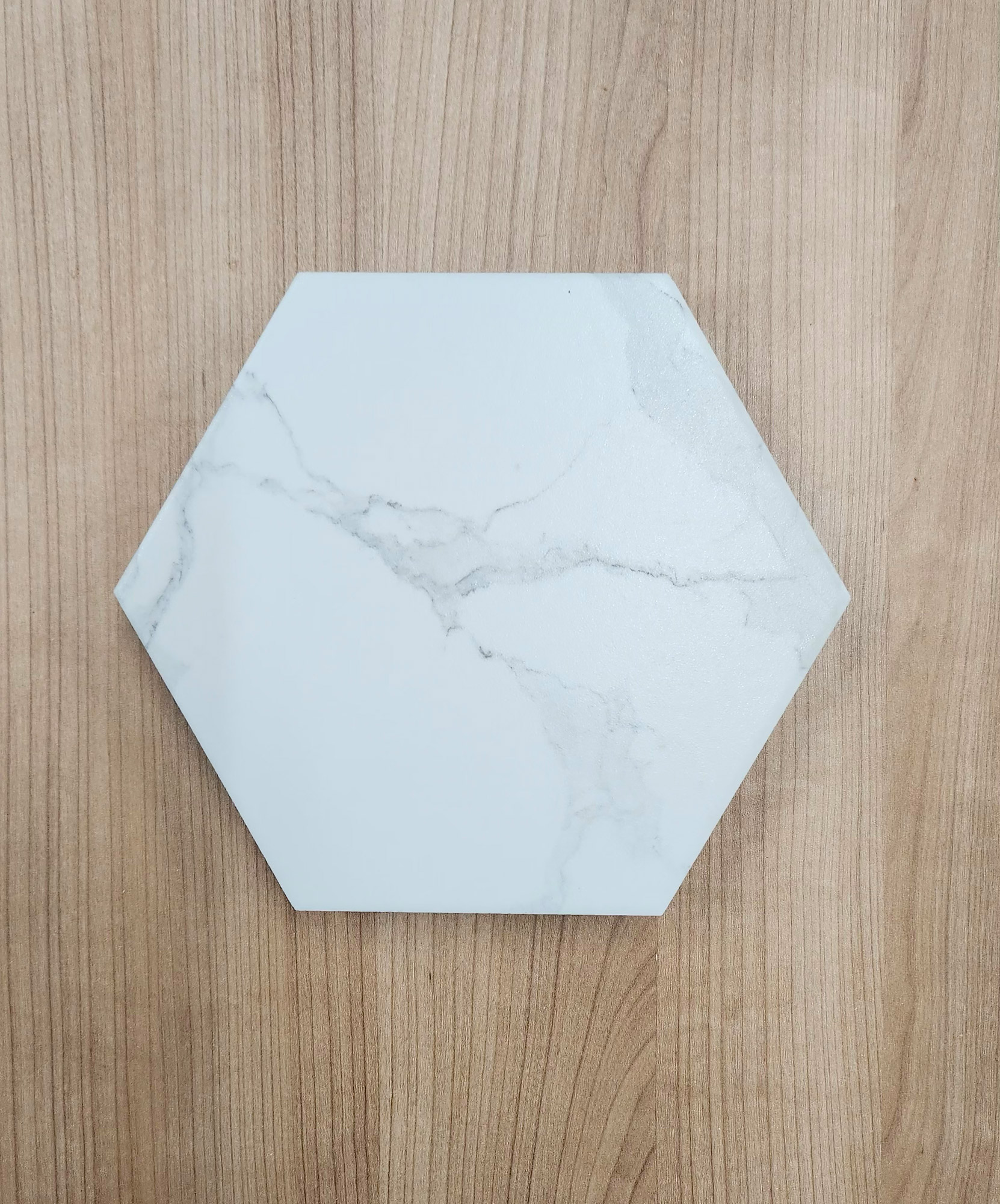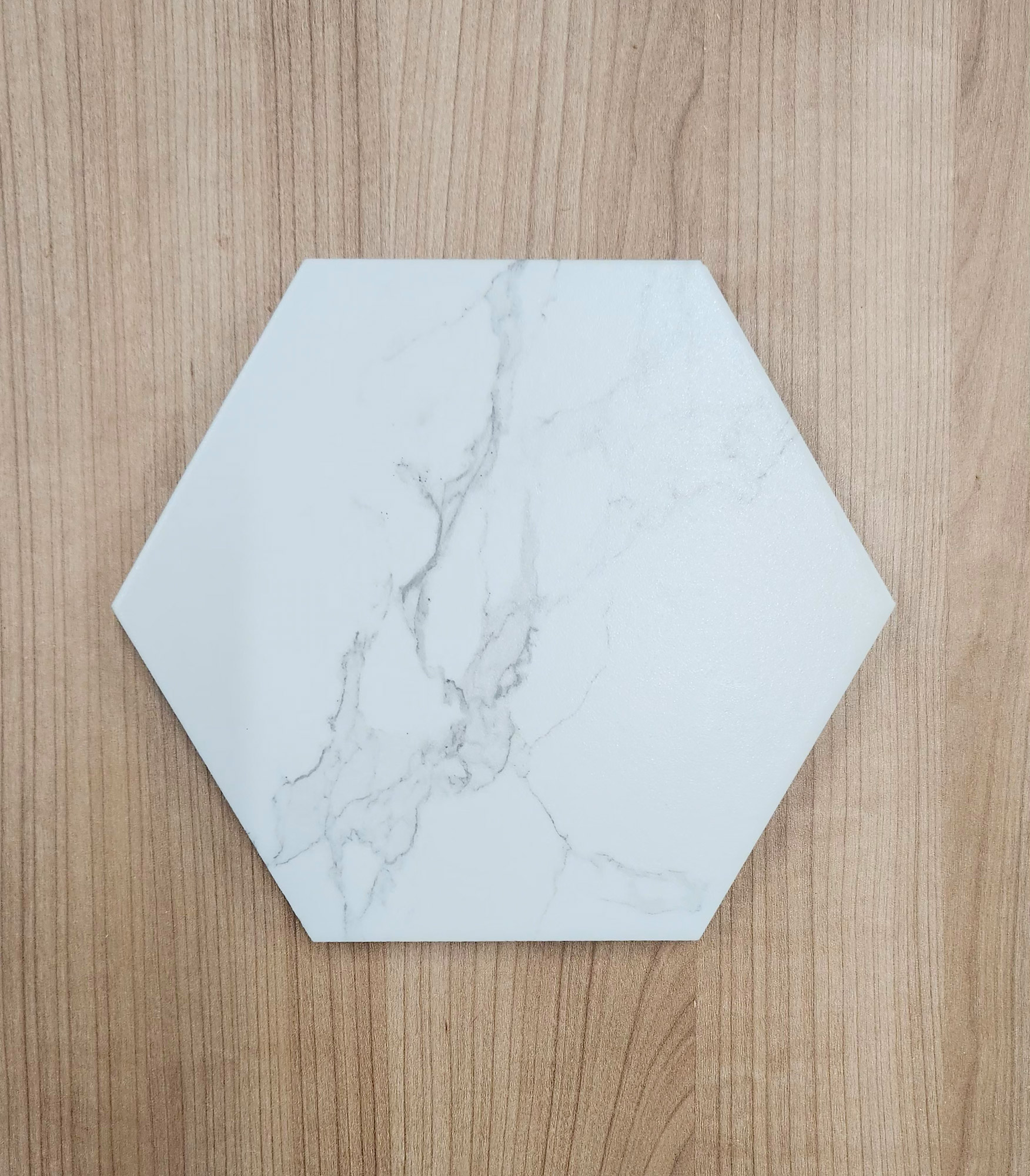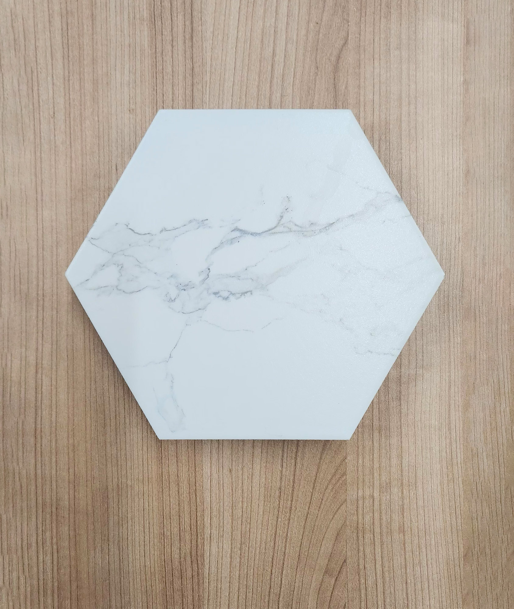 Bring timeless sophistication into your interior with white marble hexagon tiles that combine classic stone character with a modern geometric shape. Featuring delicate marble veining across each hexagon, this design creates a refined surface that feels calm, natural, and beautifully balanced. The matt finish softens the look, giving the tiles a gentle, stone-like appearance that adds depth without shine.