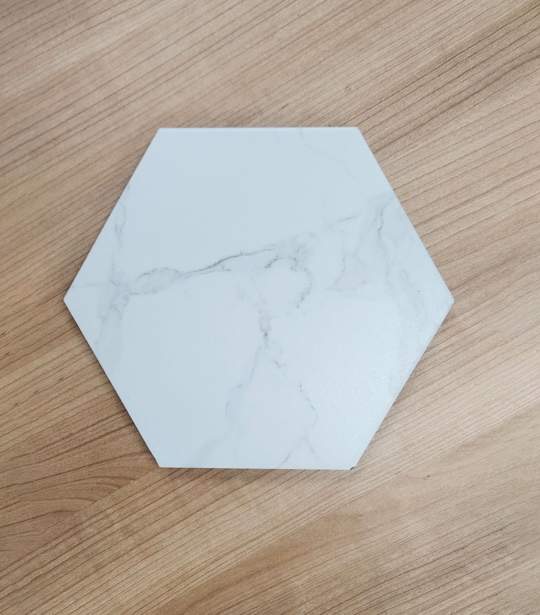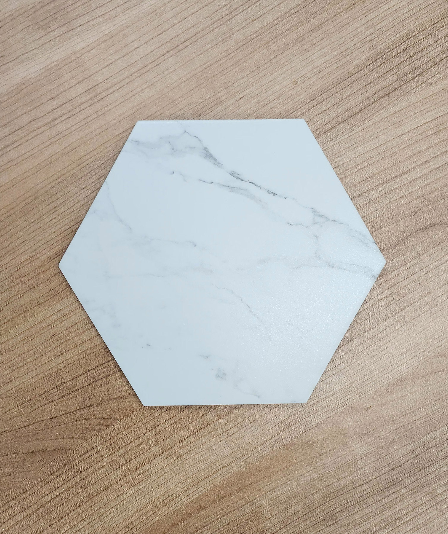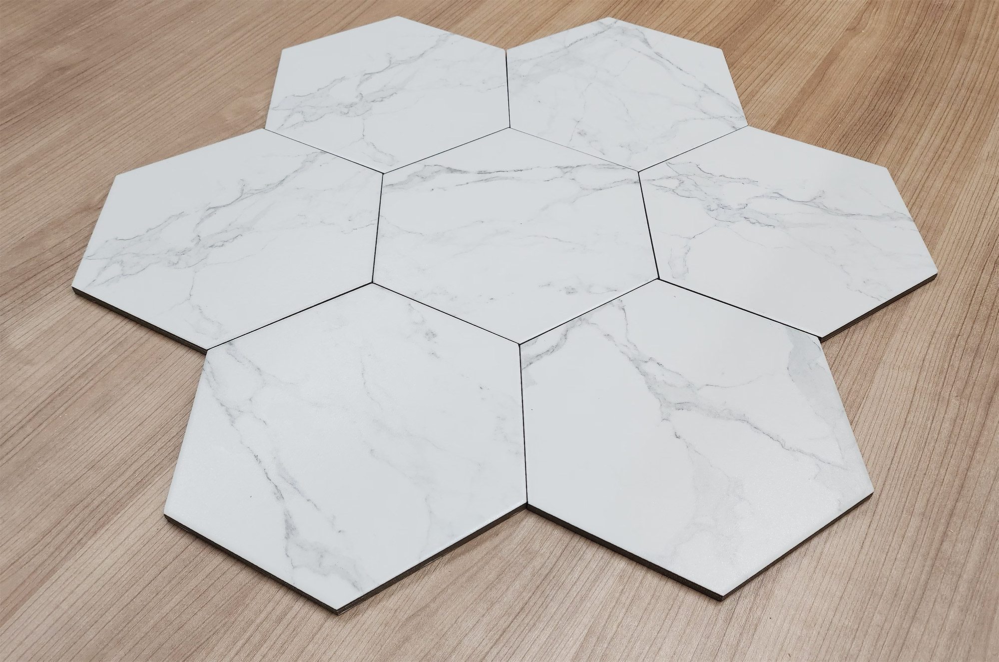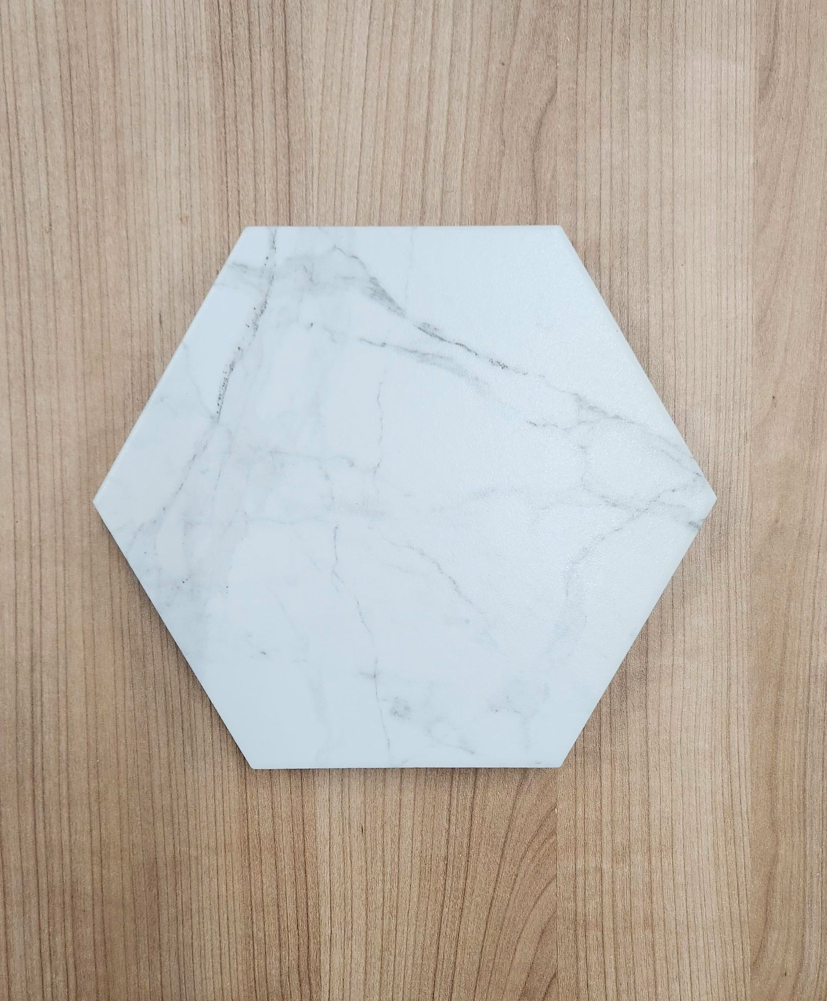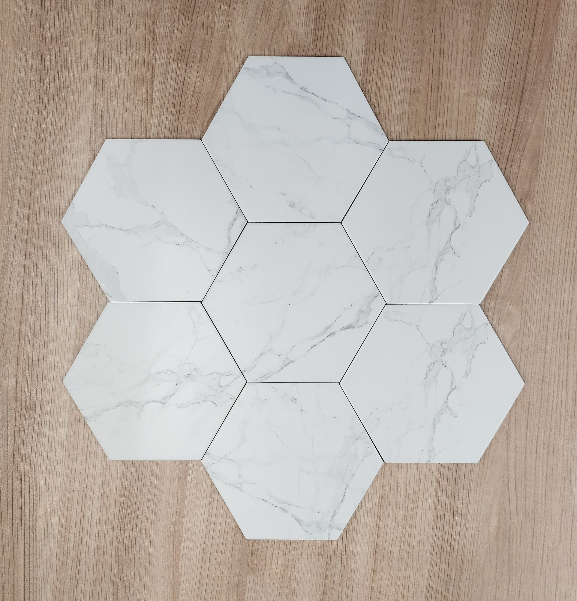 Bring timeless sophistication into your interior with white marble hexagon tiles that combine classic stone character with a modern geometric shape. Featuring delicate marble veining across each hexagon, this design creates a refined surface that feels calm, natural, and beautifully balanced. The matt finish softens the look, giving the tiles a gentle, stone-like appearance that adds depth without shine.