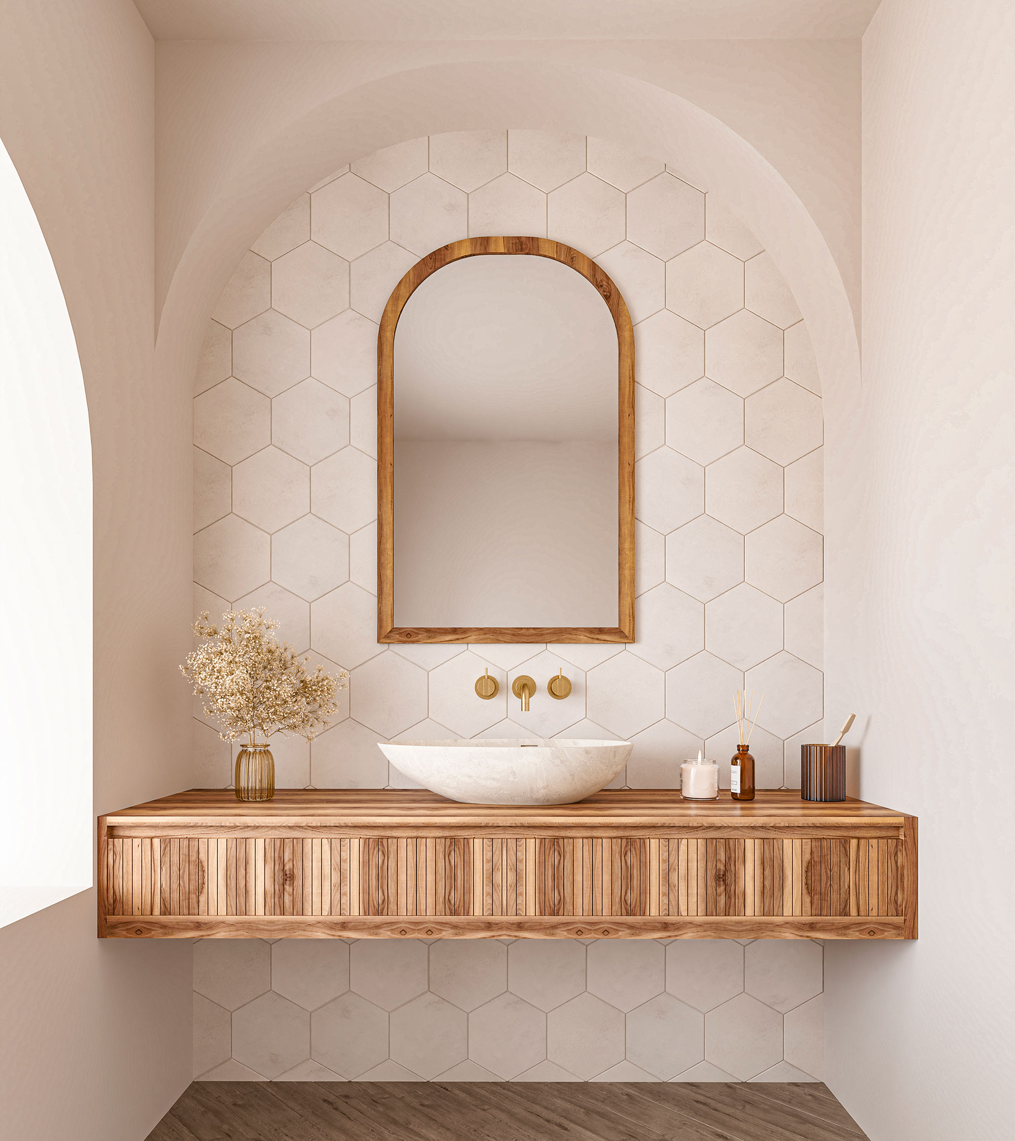 The hexagonal format adds a contemporary edge while maintaining a timeless appeal, making these tiles ideal for bathroom walls, feature niches, vanity areas, or statement panels. Their gentle variation in shade enhances depth and texture, creating a visually interesting surface without overpowering the space.