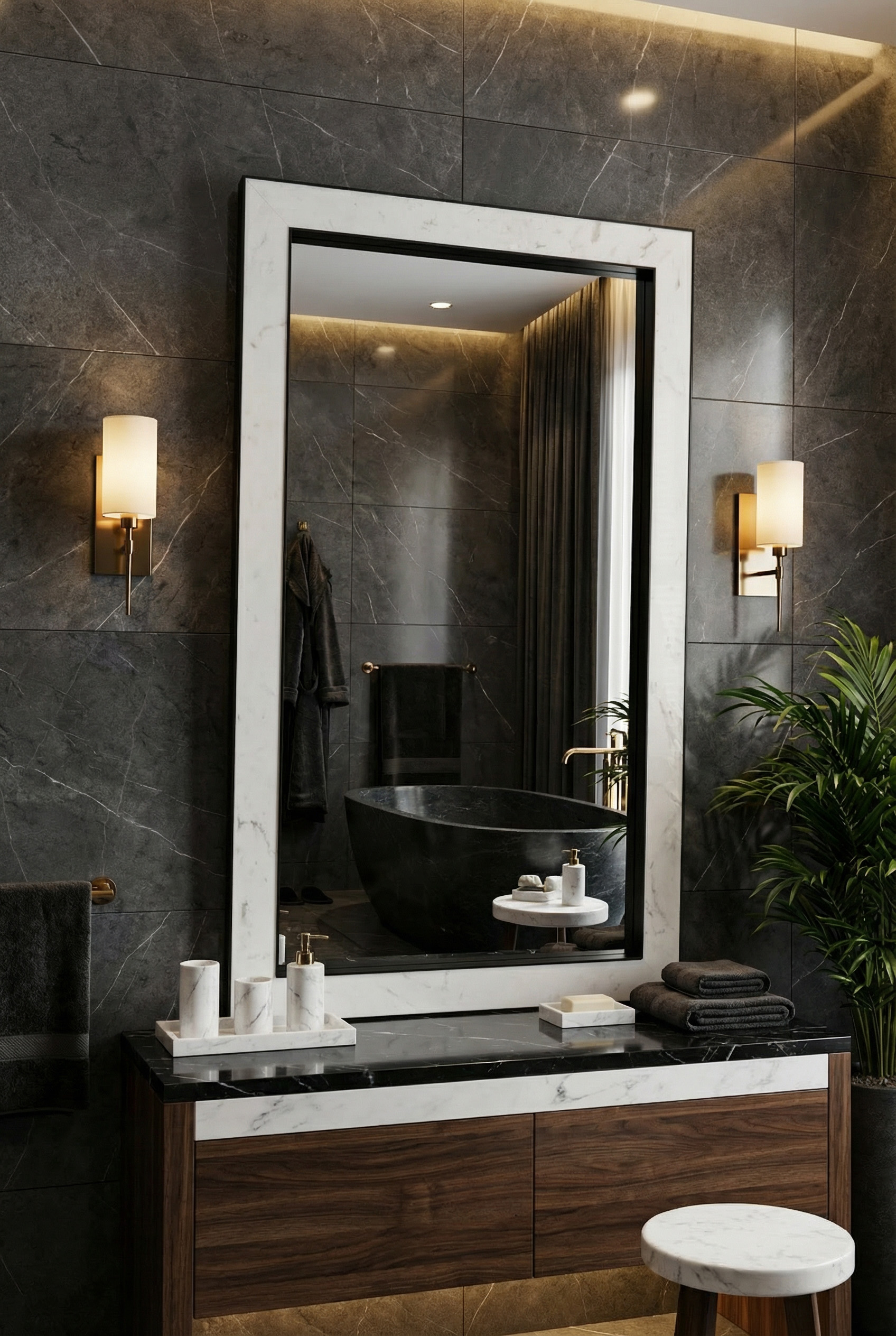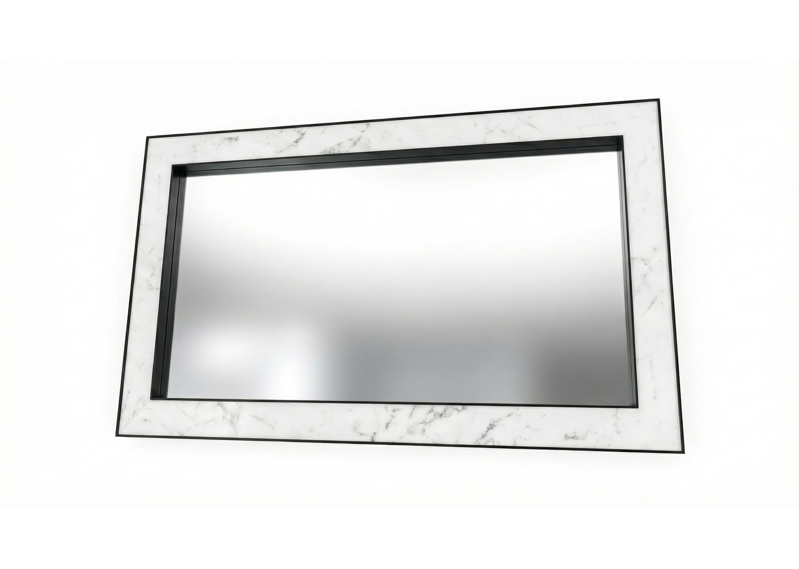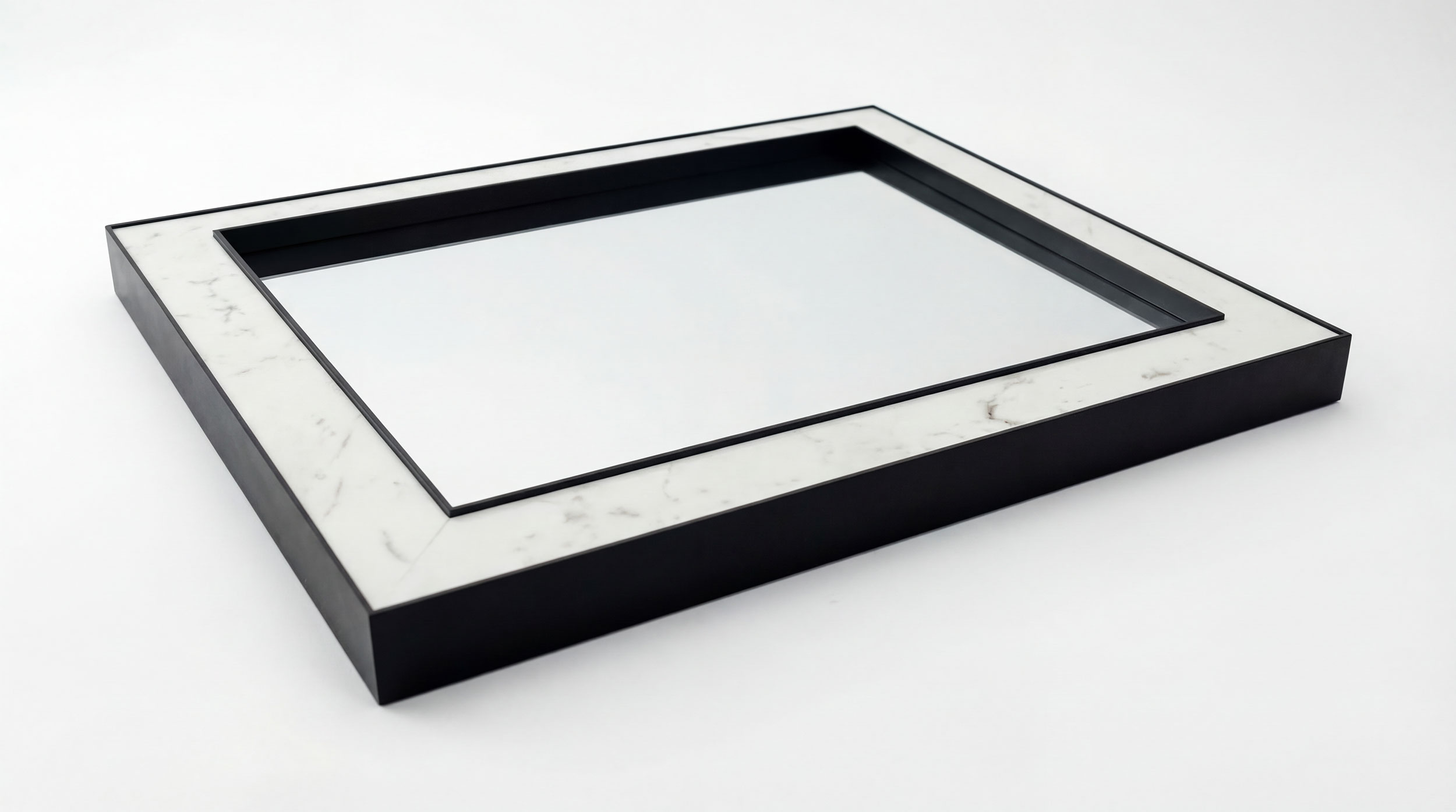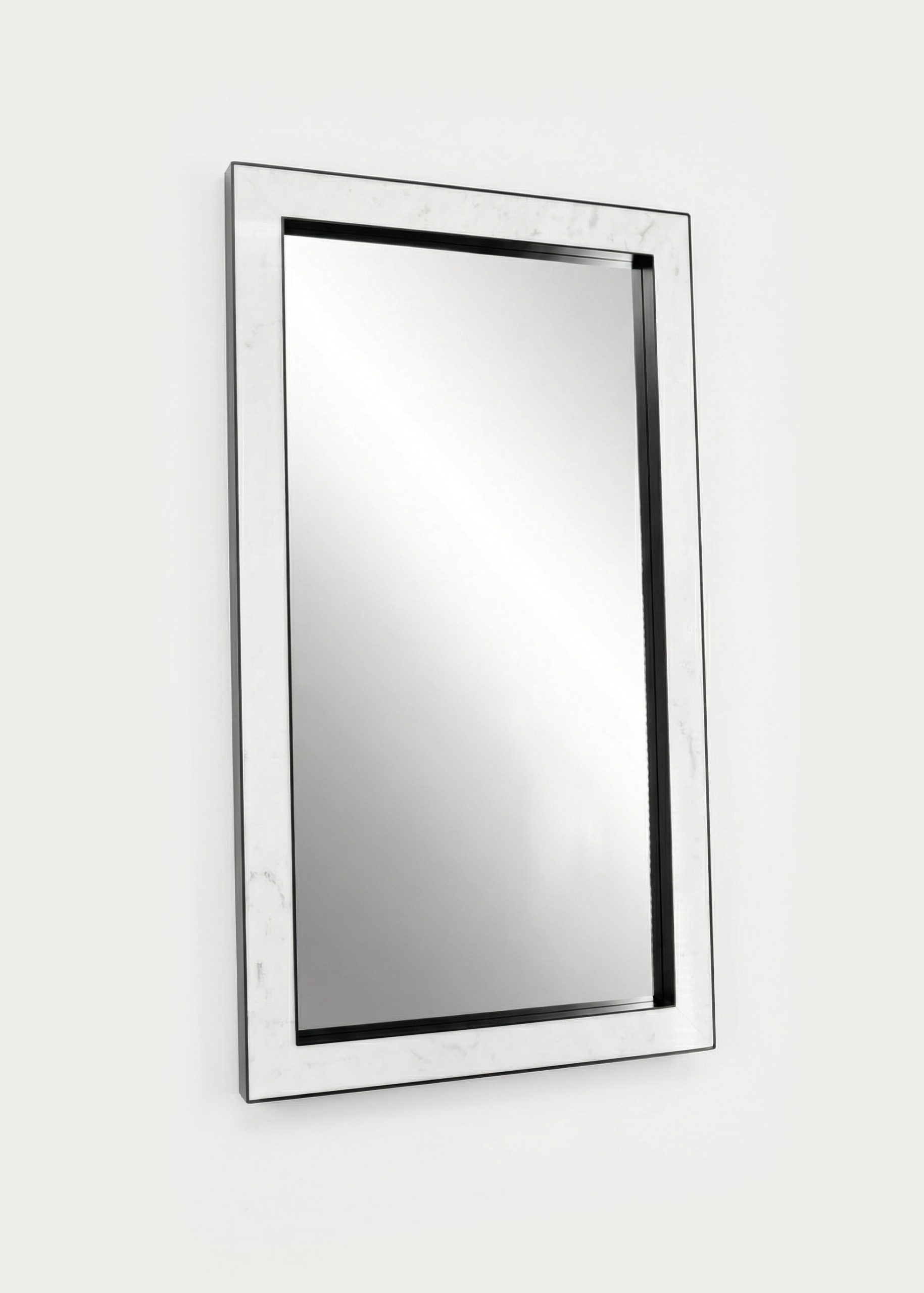 The Monolitz mirror is designed to make a statement. It combines the understated sophistication of black matte aluminium with polished Italian Bianco Carrara marble – a timeless material celebrated for its natural elegance and refined character. Subtle transitions and distinctive grey-to-graphite veining give the marble depth and movement, creating a striking contrast that feels equally at home in classic interiors and contemporary spaces.
