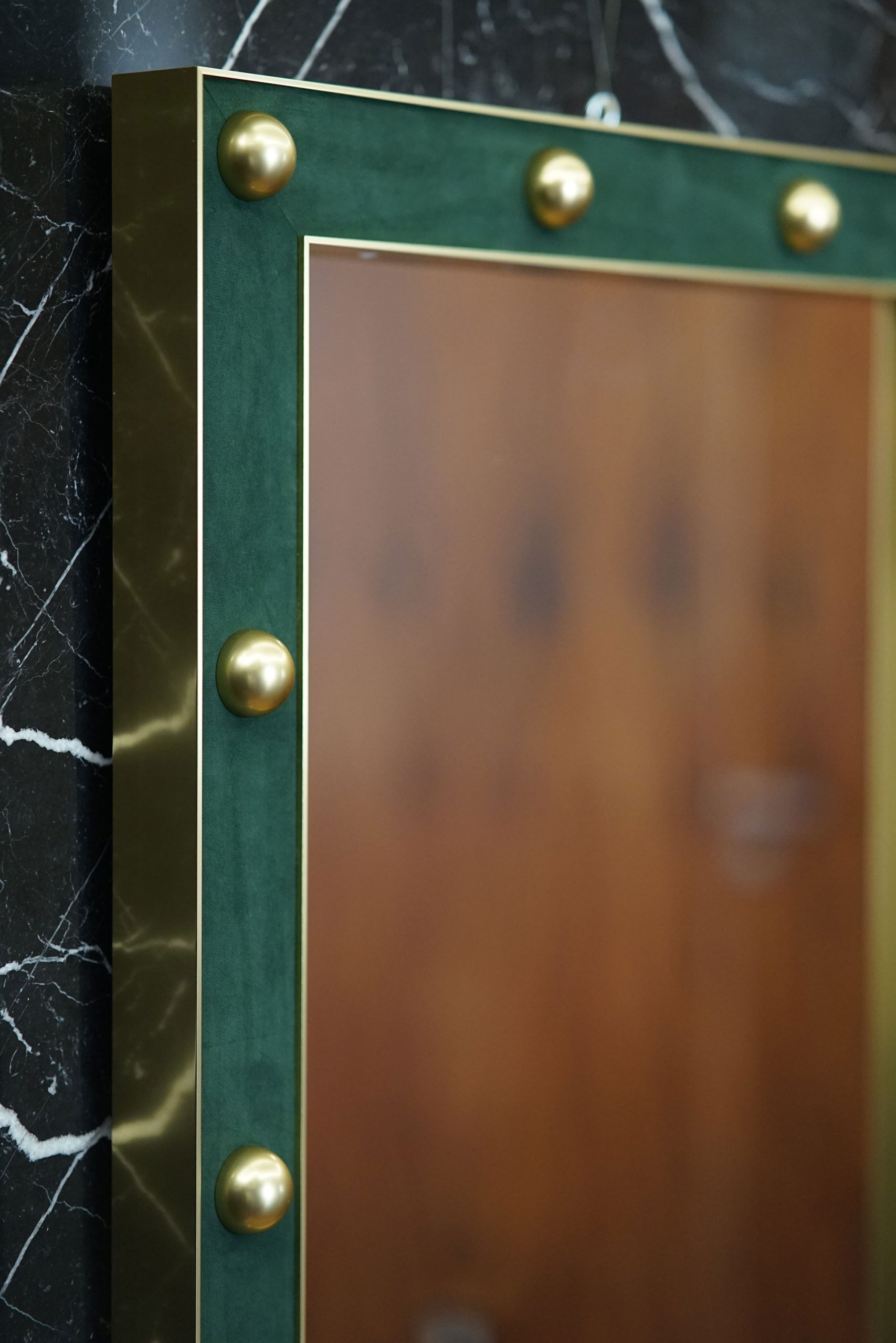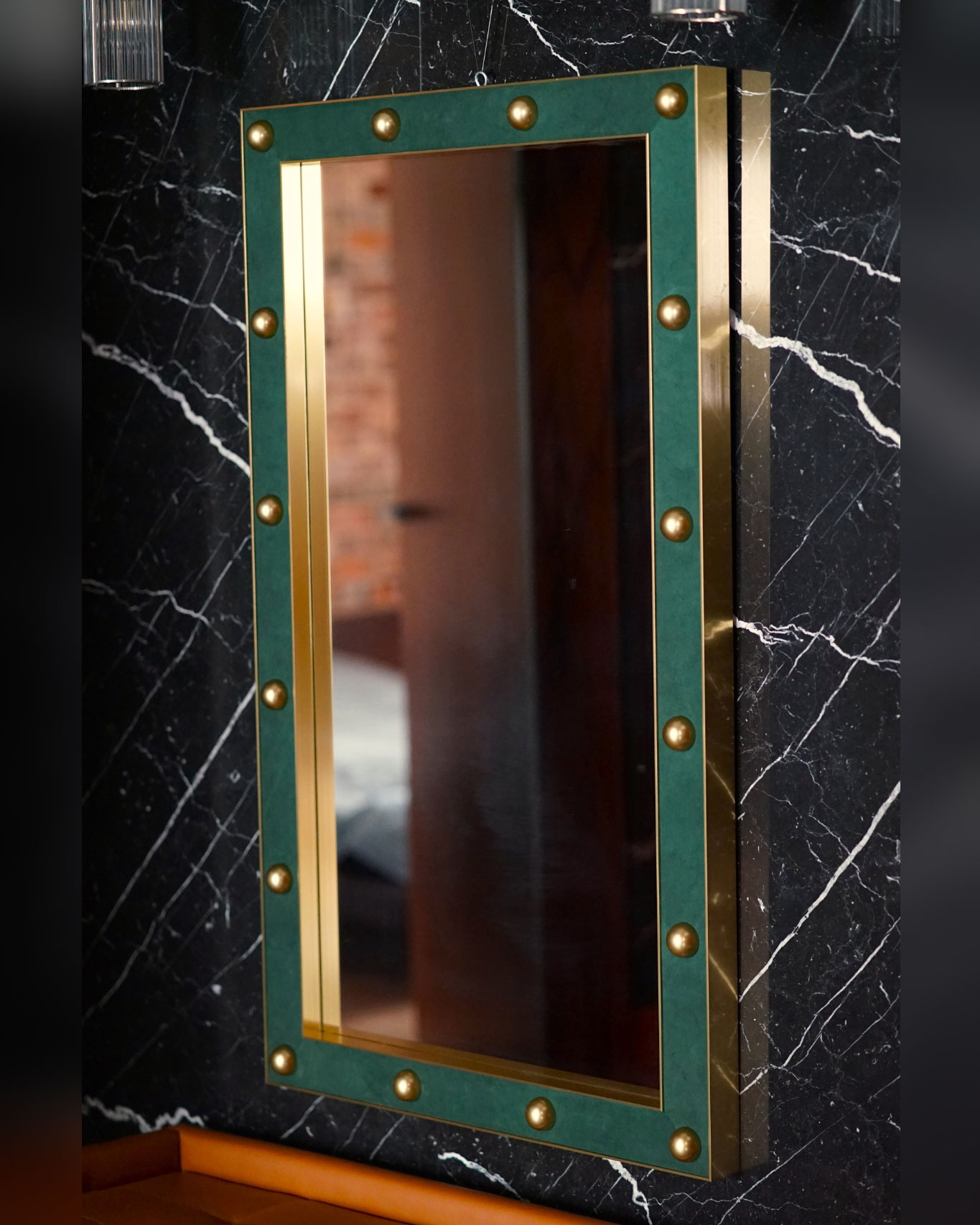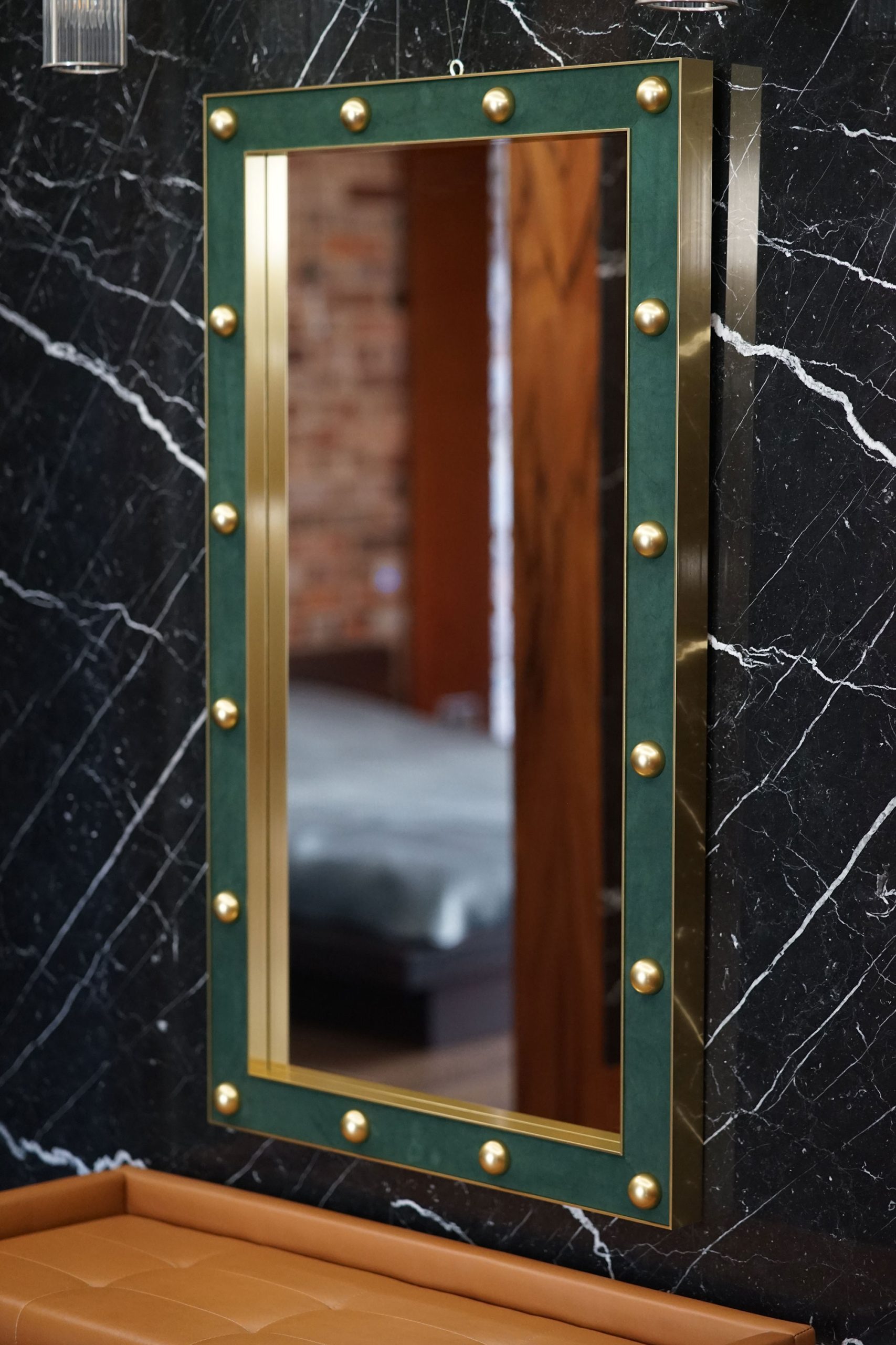 Carefully placed decorative aluminium accents add depth and a distinctive, artistic presence, turning the mirror into a true statement piece rather than a simple accessory. The natural leather detailing introduces a sense of exclusivity and timeless appeal, ensuring the design remains stylish for years to come.